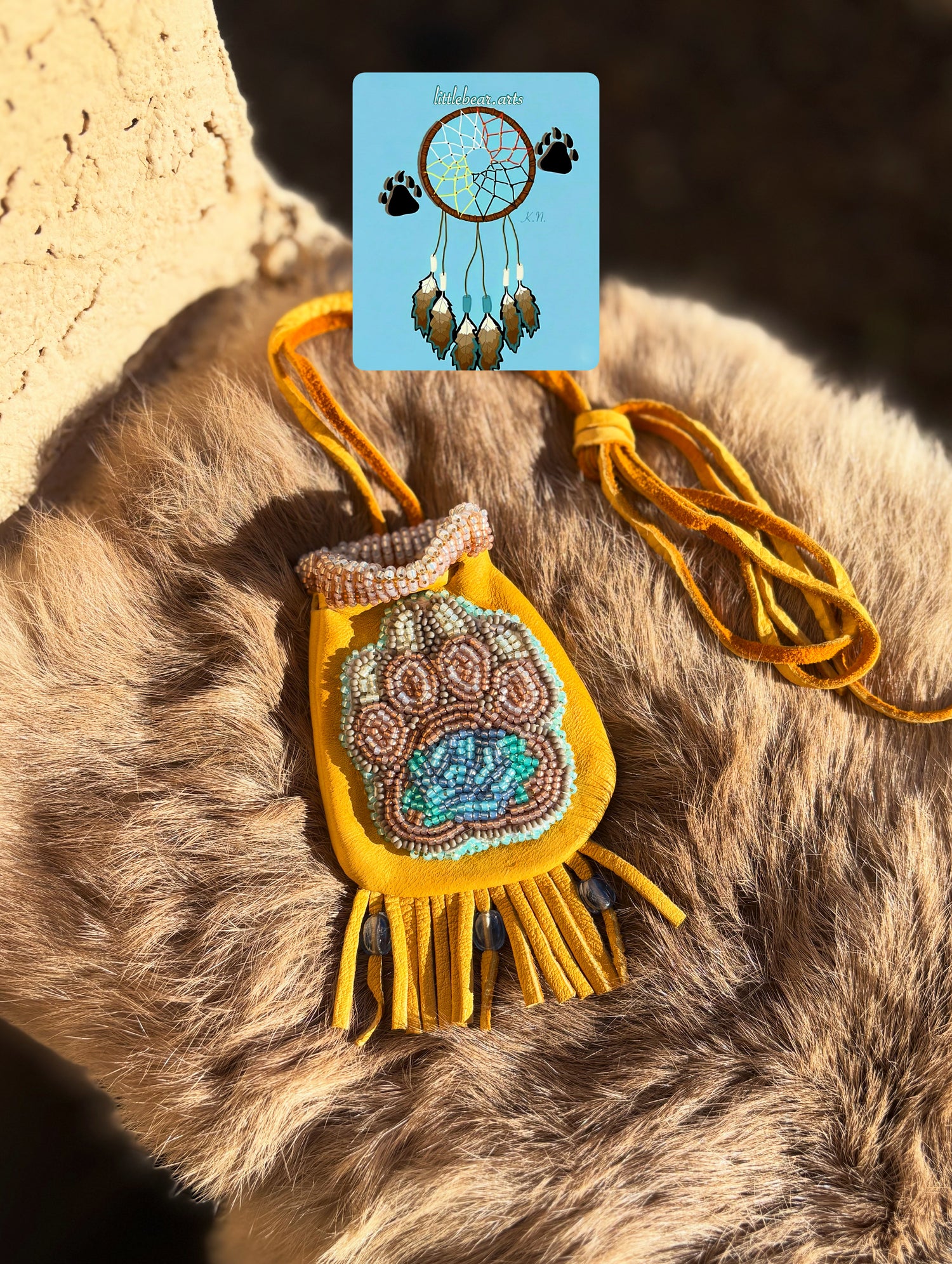 Ojibwe medicine pouches or medicine bags, are small handmade leather pouches used to carry sacred items of spiritual or personal significance. Traditionally made from animal hide or cloth and often worn around the neck or carried on the body, these pouches hold objects like herbs, stones, tobacco, sweetgrass, or small tokens that represent protection, healing, or connection to the spirit world. For the Ojibwe people, the contents of a medicine pouch are deeply personal and chosen based on individual spiritual needs or life experiences. The pouch itself is considered sacred and is treated with great respect. It is not meant to be opened or handled by others, as its power is tied to the person who carries it. Medicine pouches reflect the Ojibwe belief in the balance between physical and spiritual health, and they are still used today in both traditional ceremonies and daily life as symbols of healing, strength, and cultural identity.