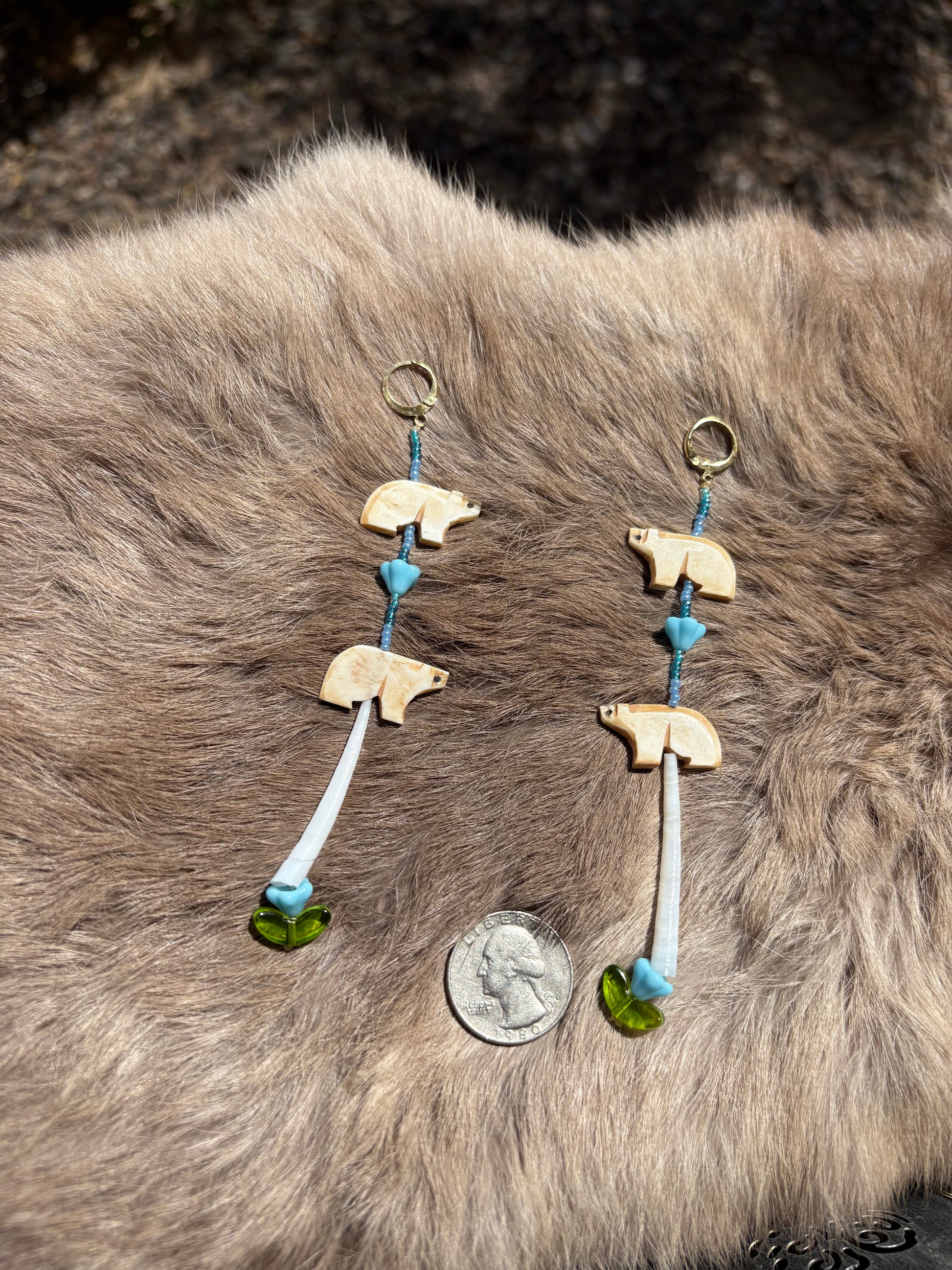 Carved cow bone beads on hypoallergenic hoop clasps. with dentallium shells and delica size 11 beads, blue floral and leaf beads. Strung together with artificial sinew.
