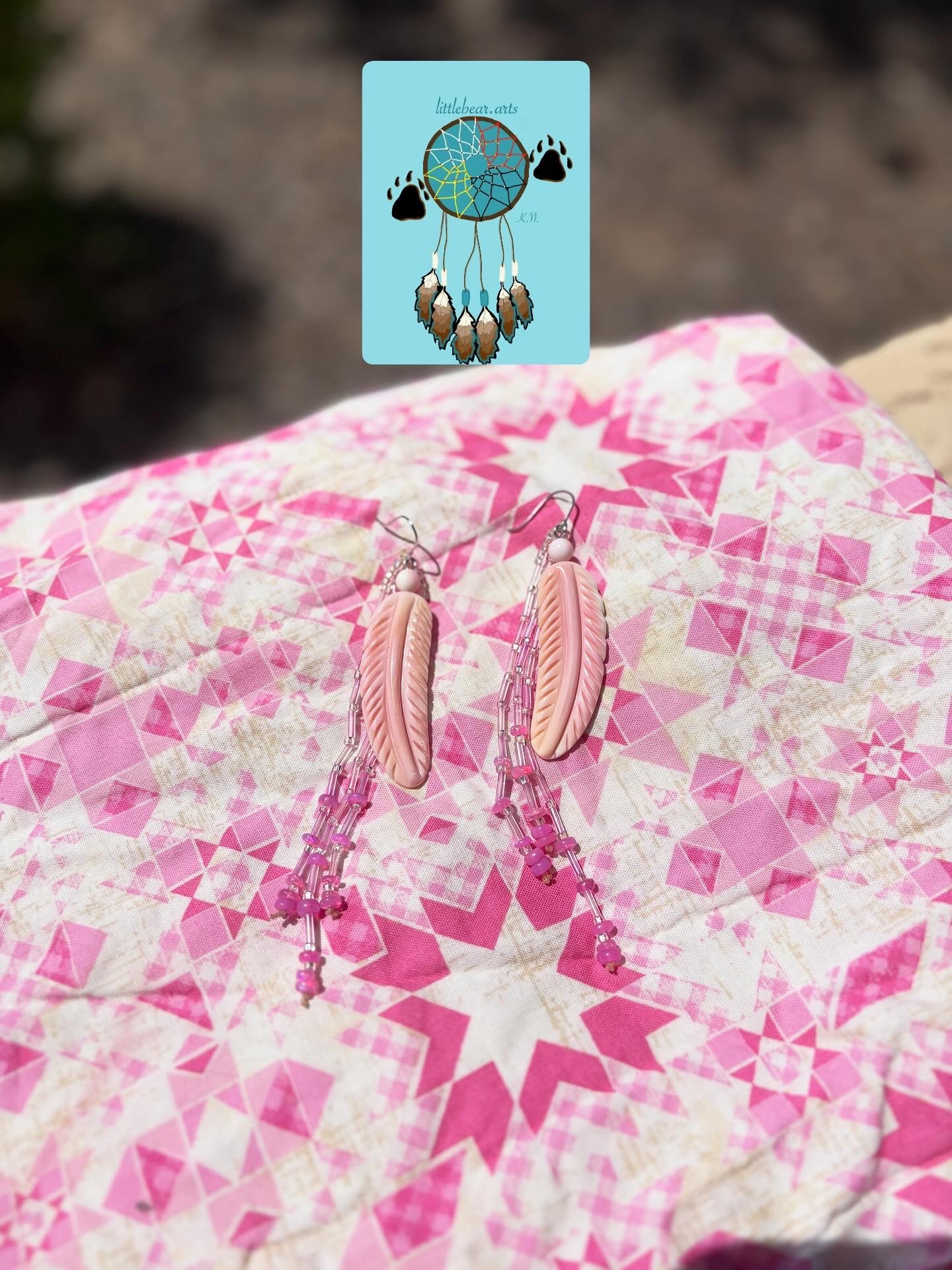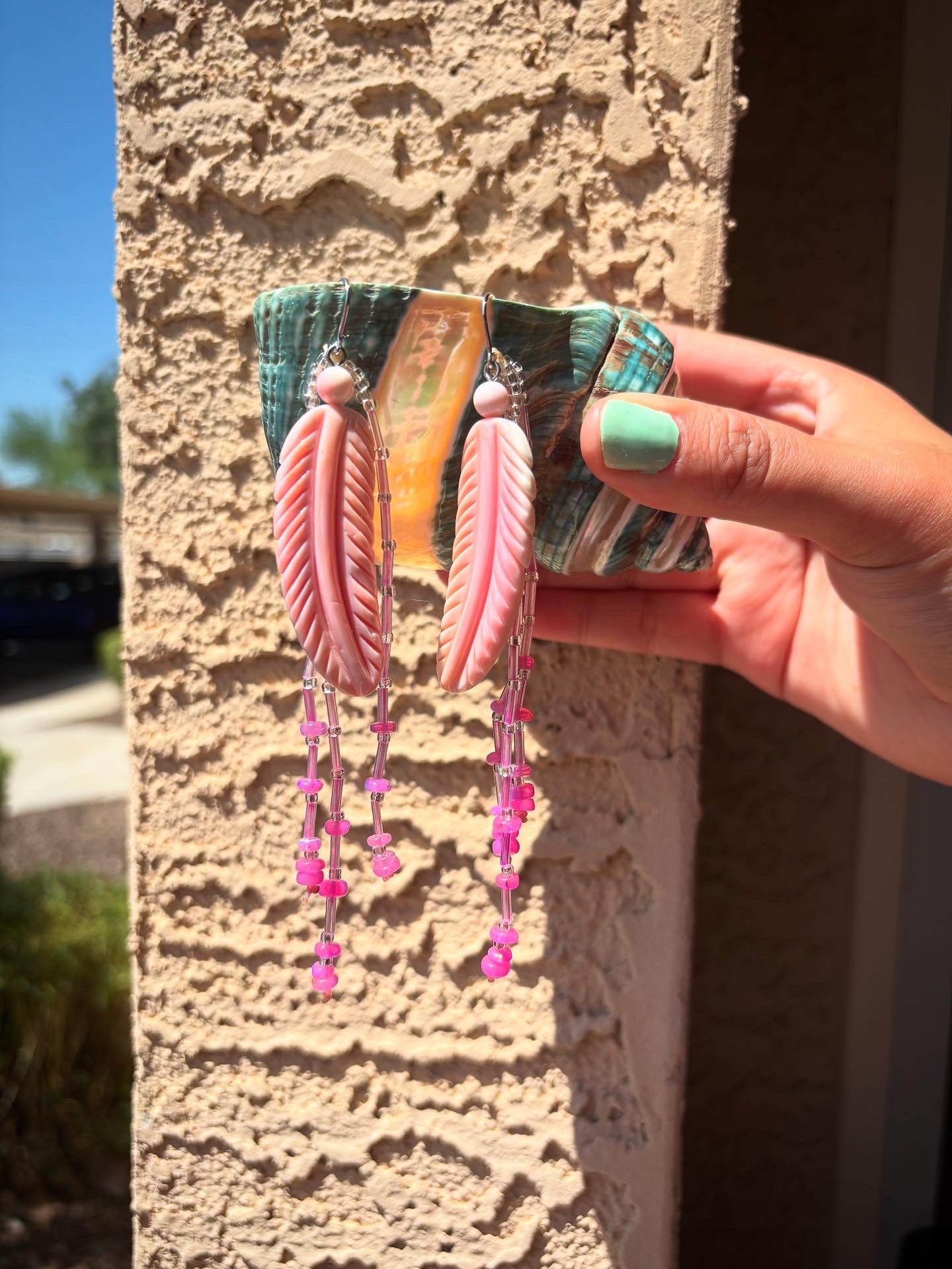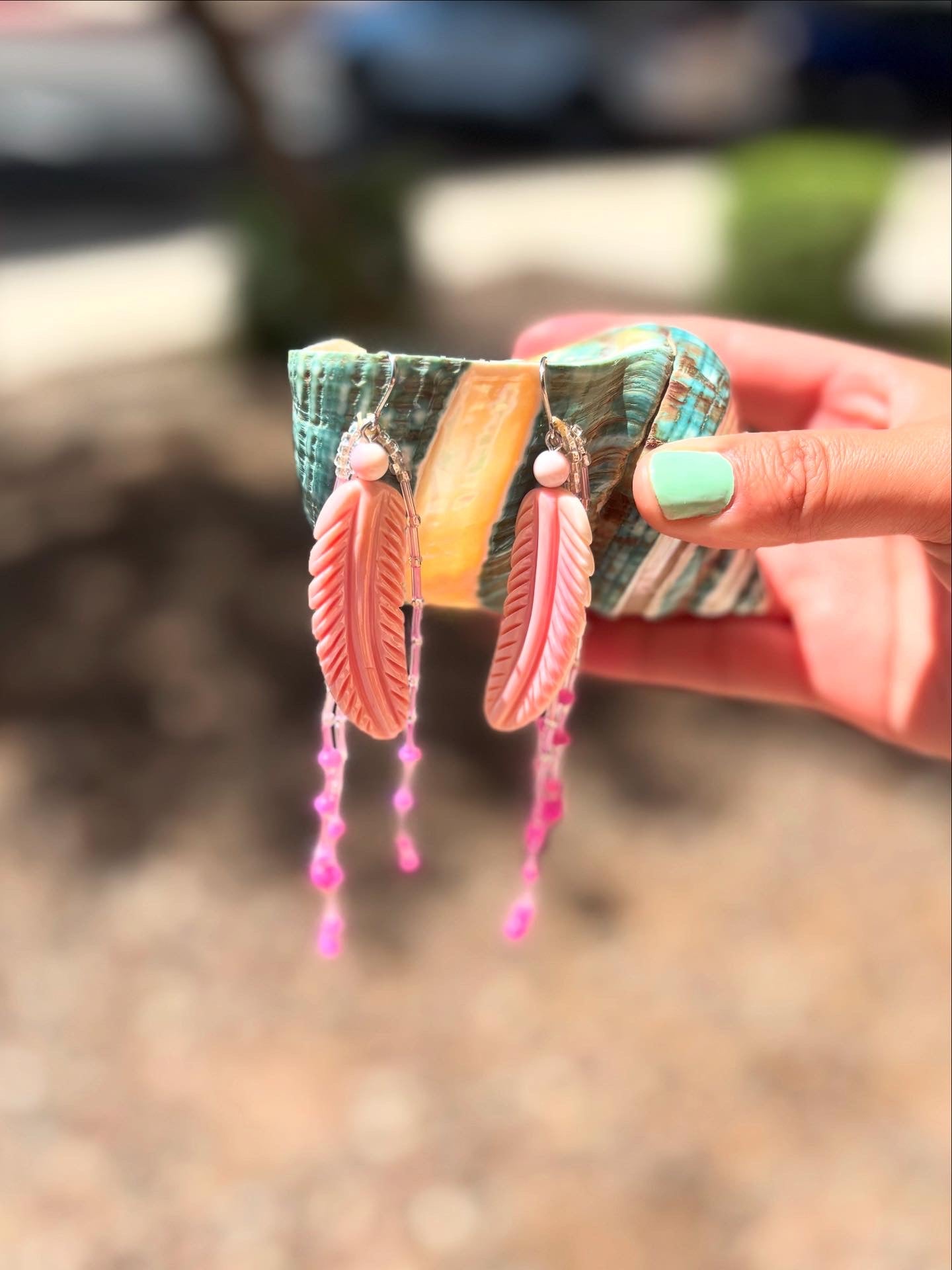 925 Sterling Silver hooks, 5 inches in length. Carved pink conch shell, genuine pink opal beads, vintage delica beads, strung together with artificial sinew.