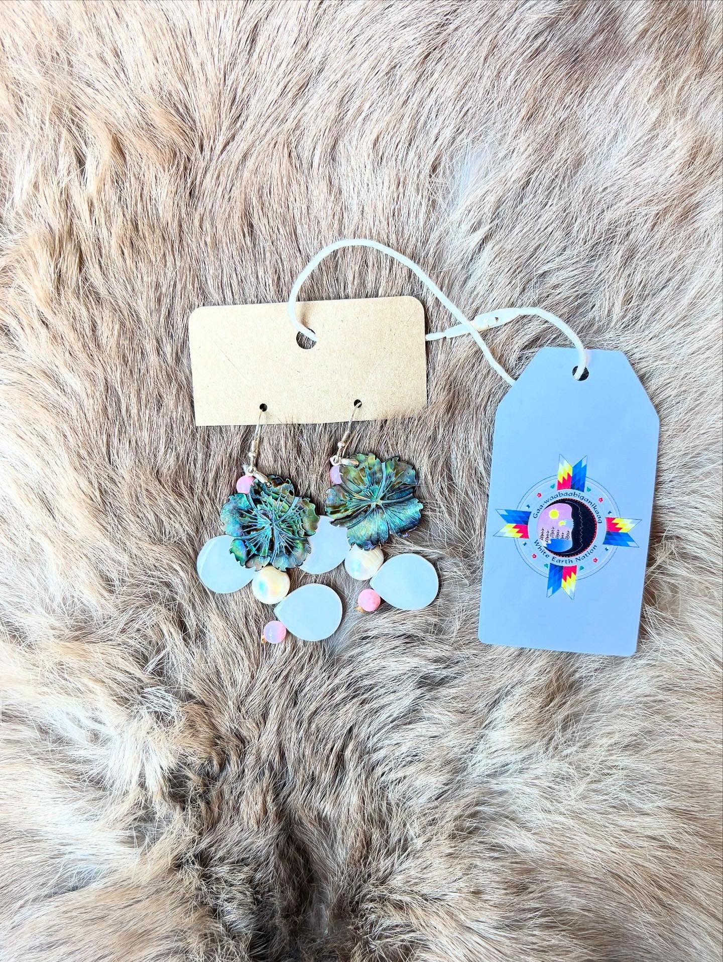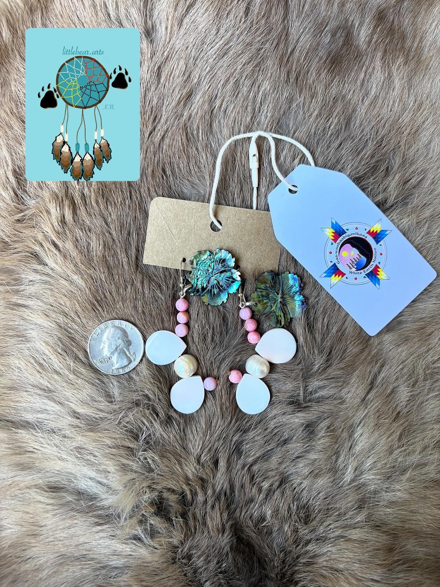 925 Sterling Silver hooks with abalone shell florals, pink opal and pink conch beads.