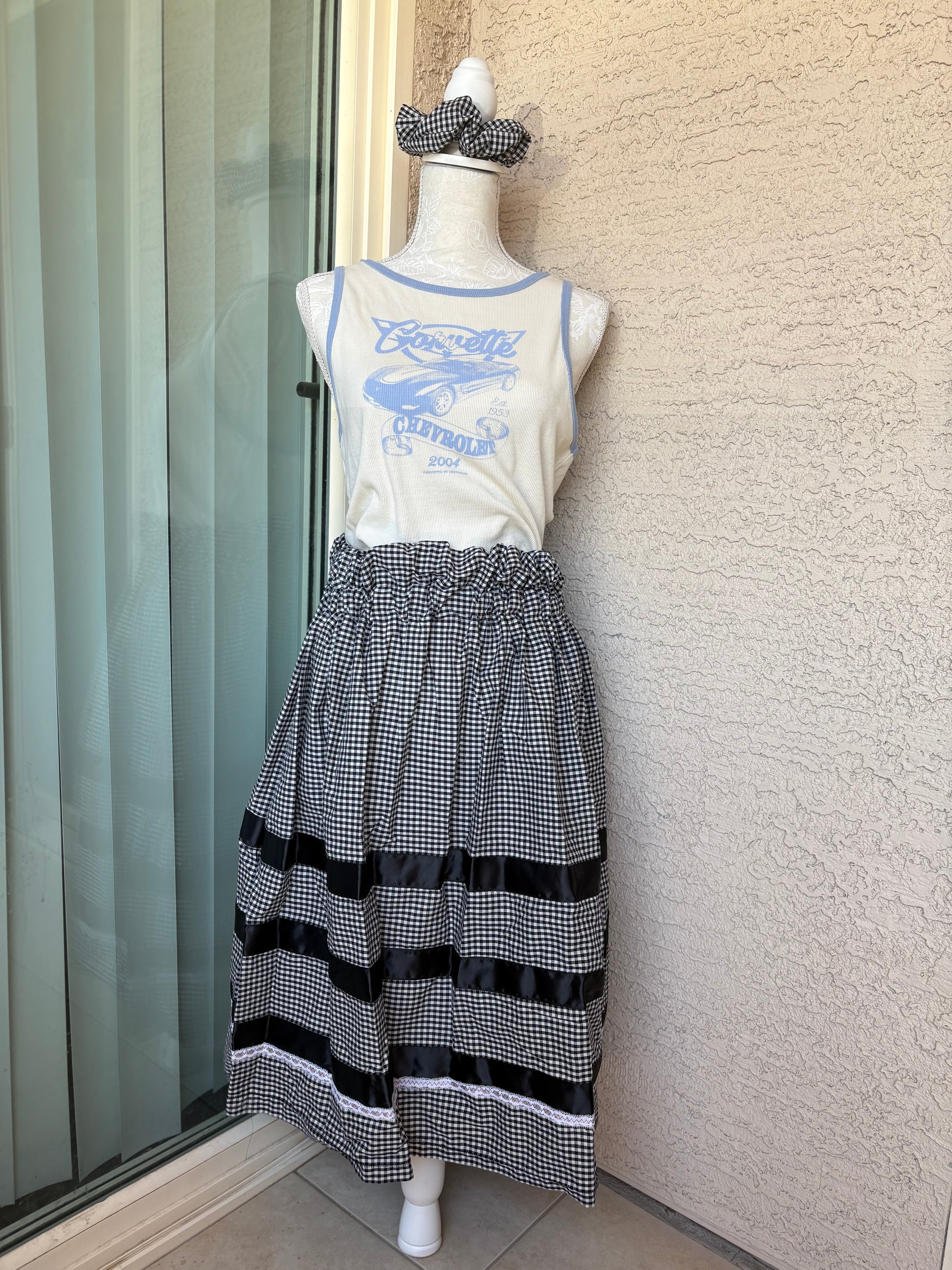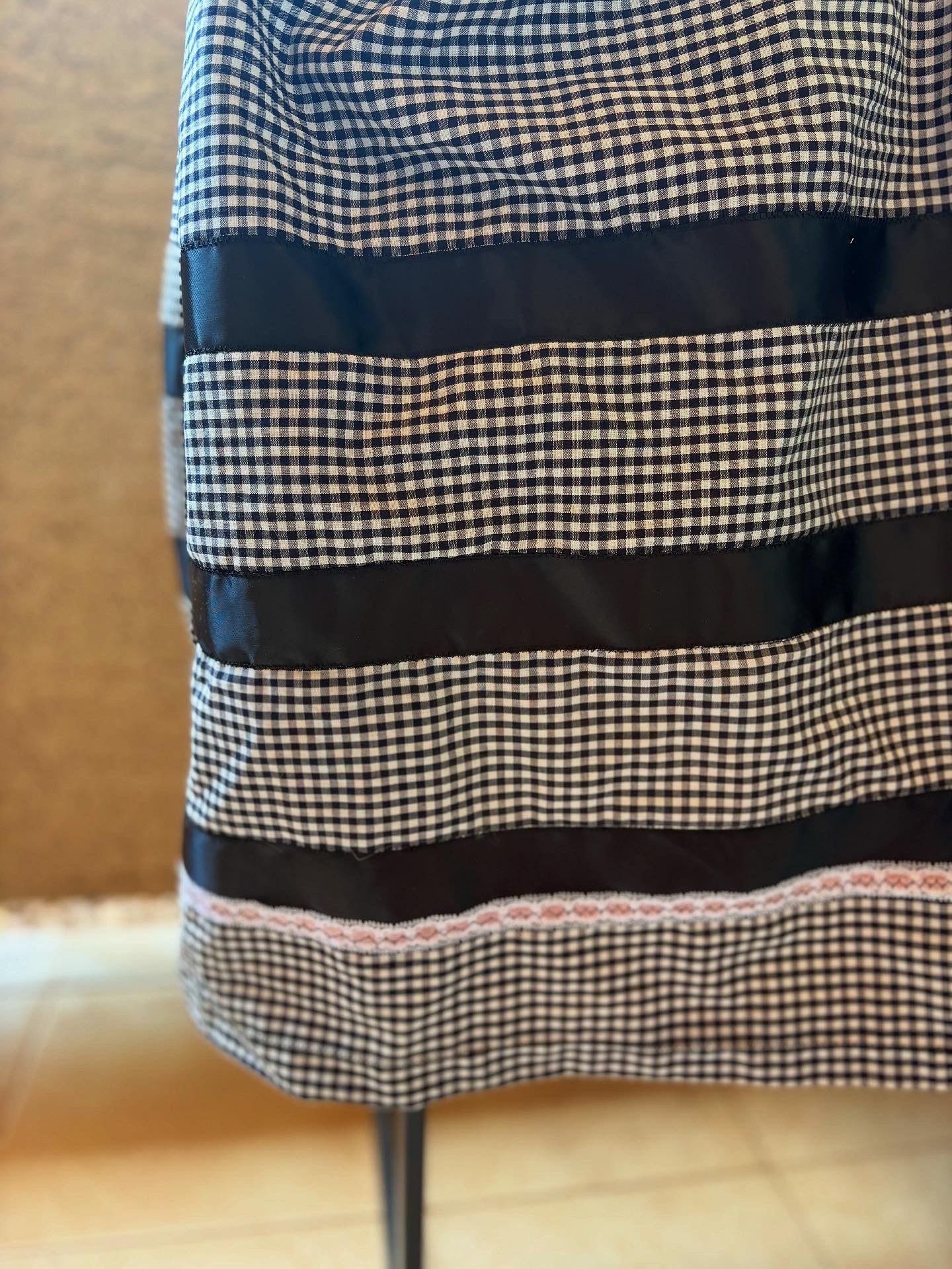 Cotton Gingham fabric with satin ribbons and pink lace.