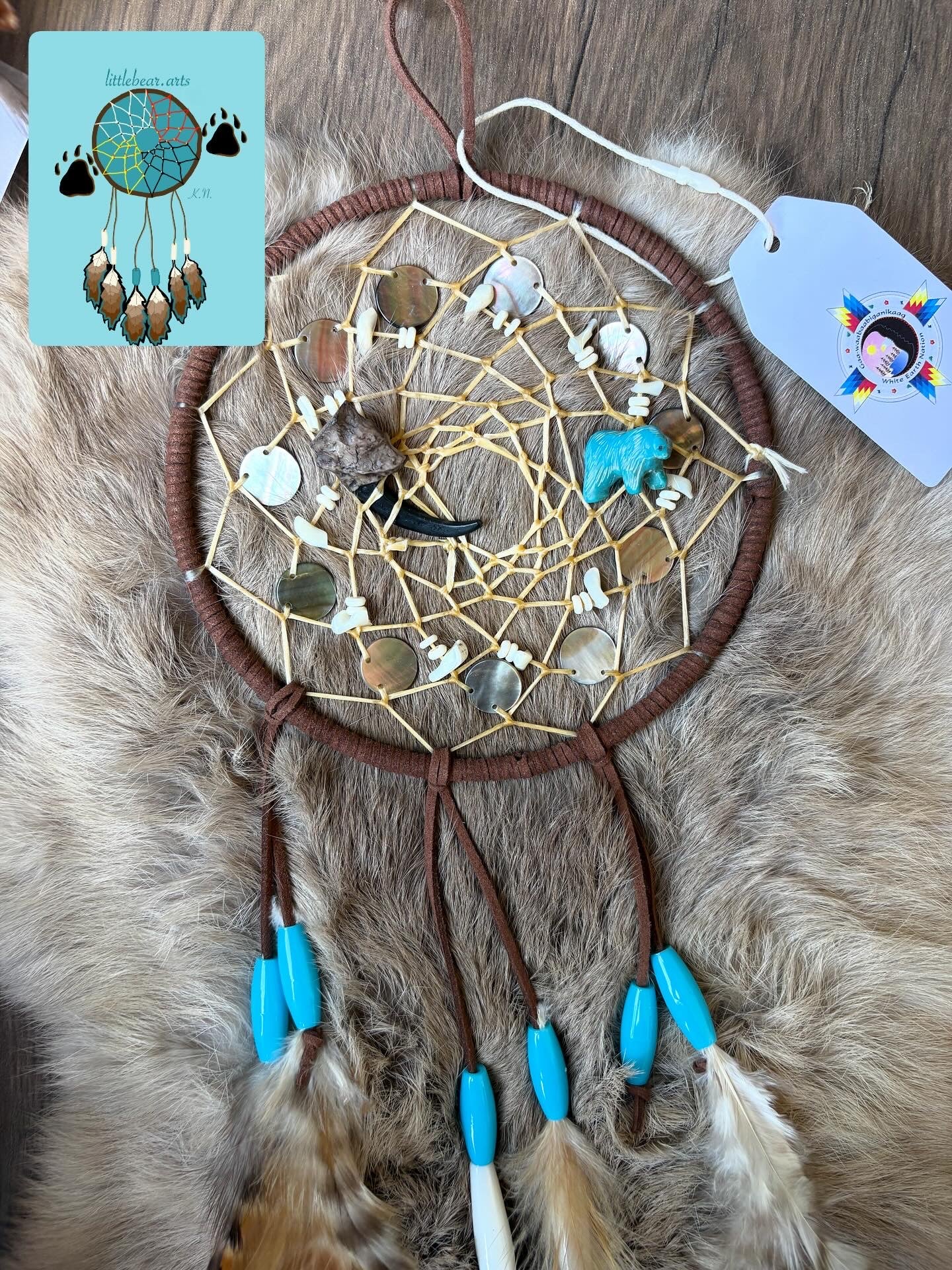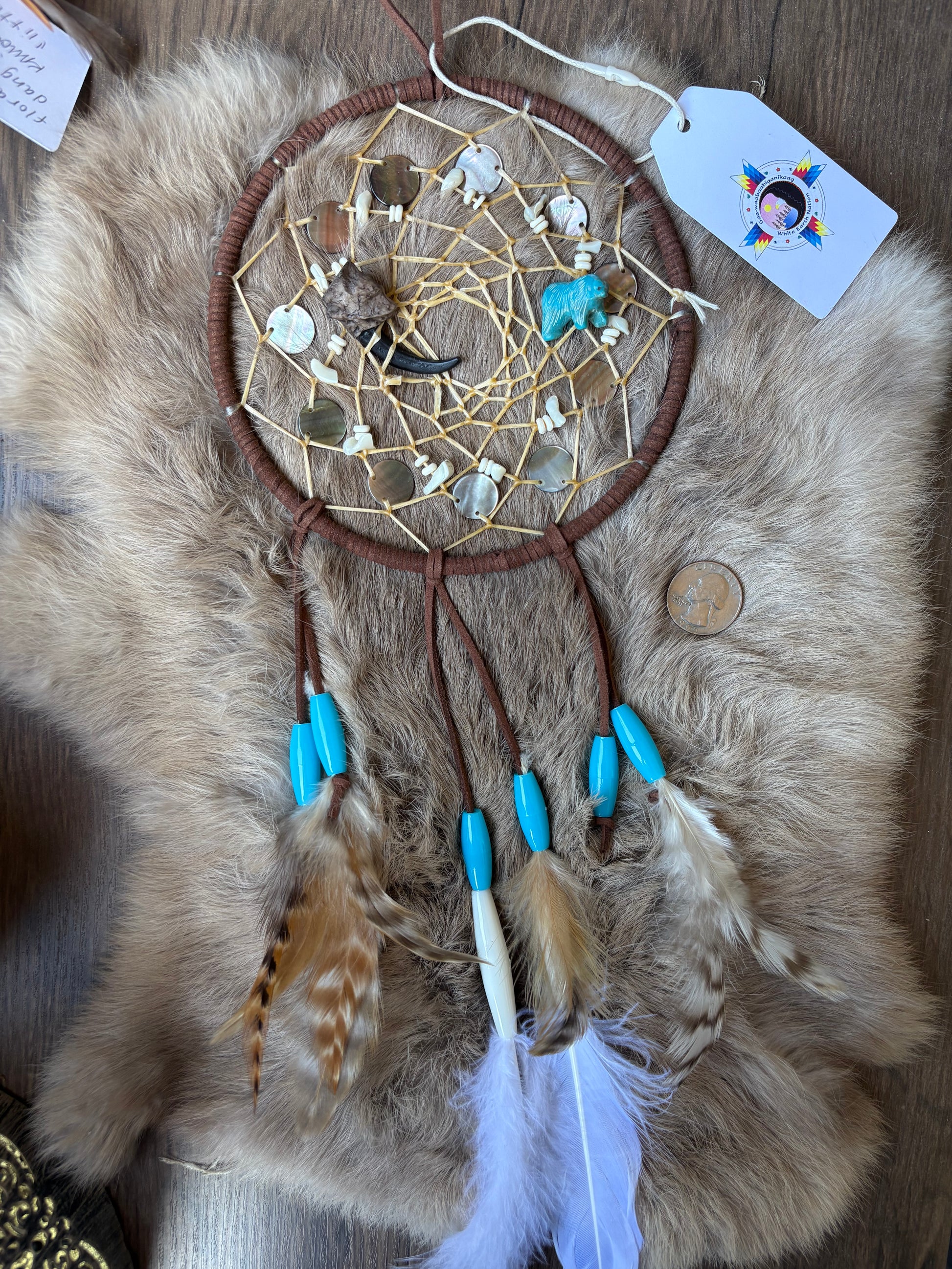6 inch dreamcatcher, abalone shells, faux eagle claw and turquoise colored bear. leather and pheasant feathers used