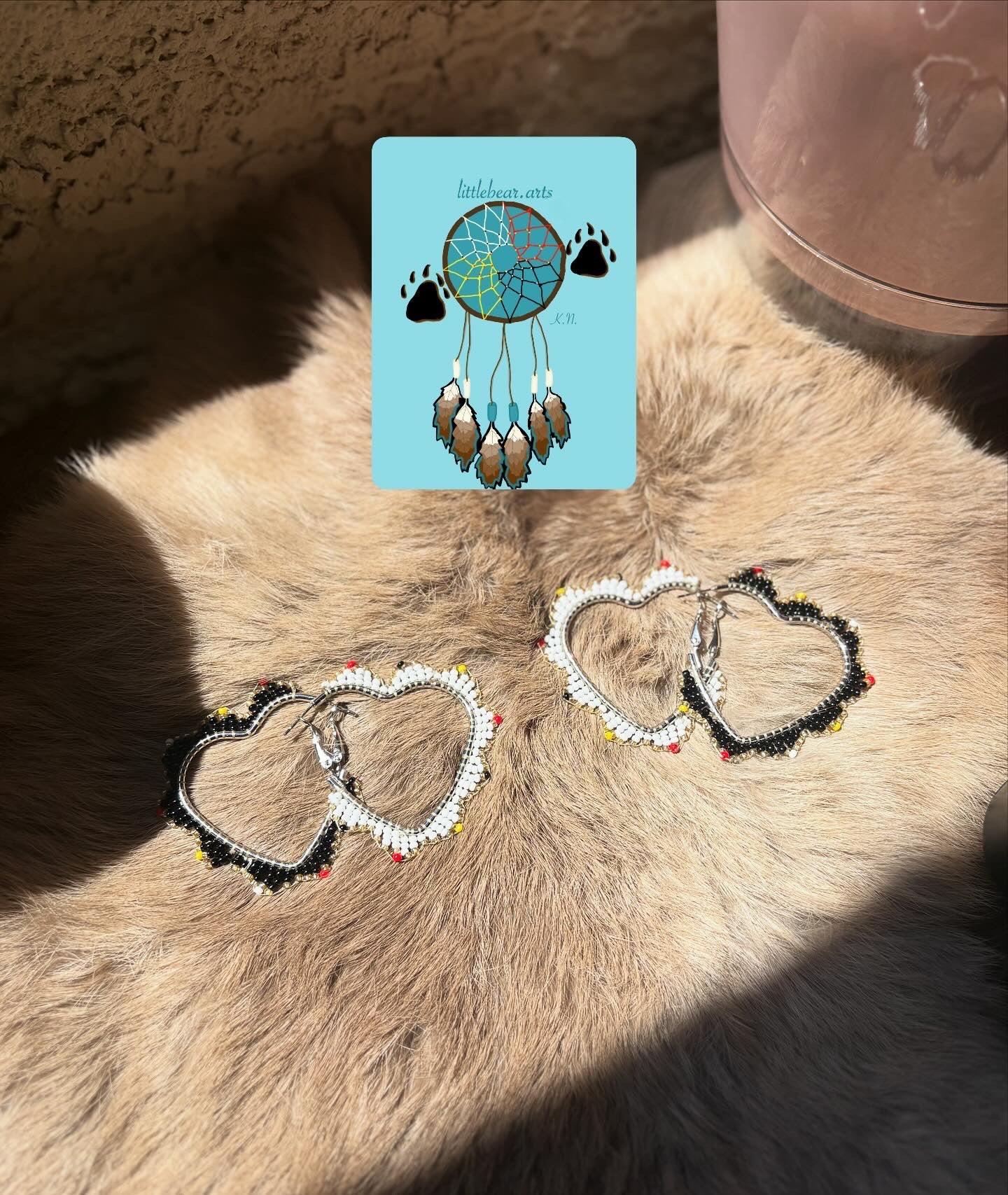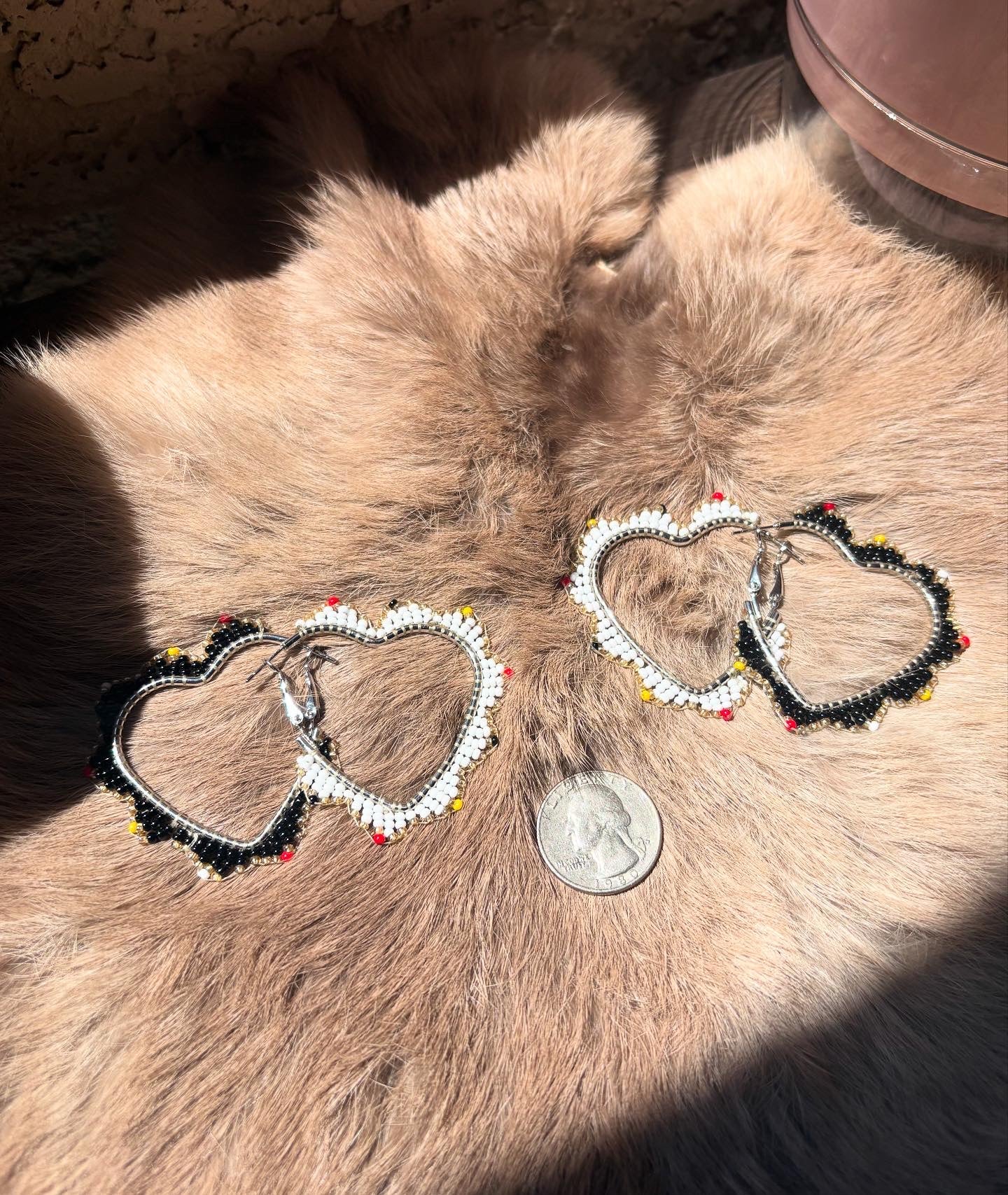 Native Medicine color beaded heart hoops, mismatch style. ONE pair. For non sensitive ears, stainless steel metal.