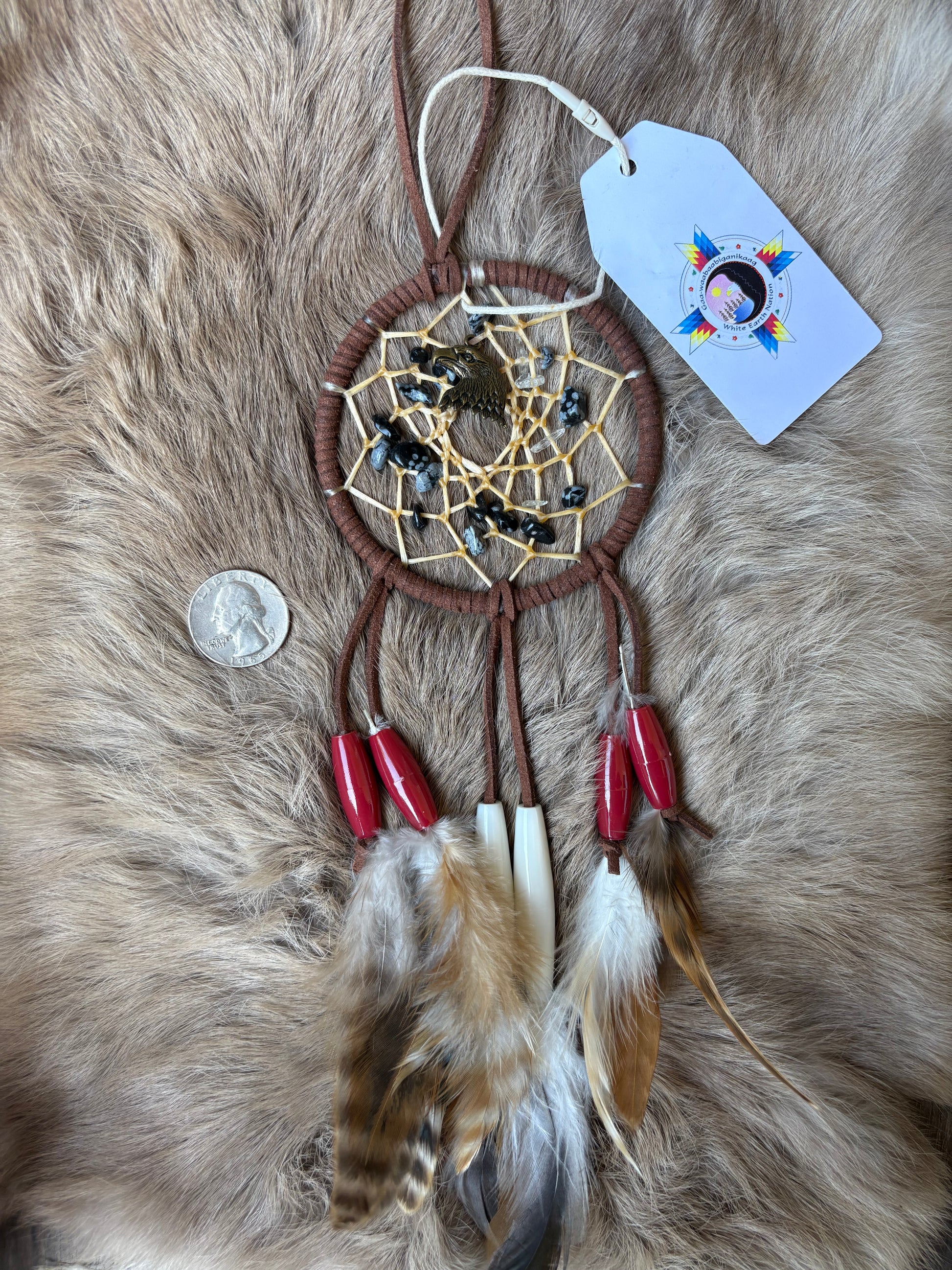 3 inch in diameter. Materials used are artificial sinew and bone beads. Black Obsidian stone beads and eagle charm with pheasant feathers
