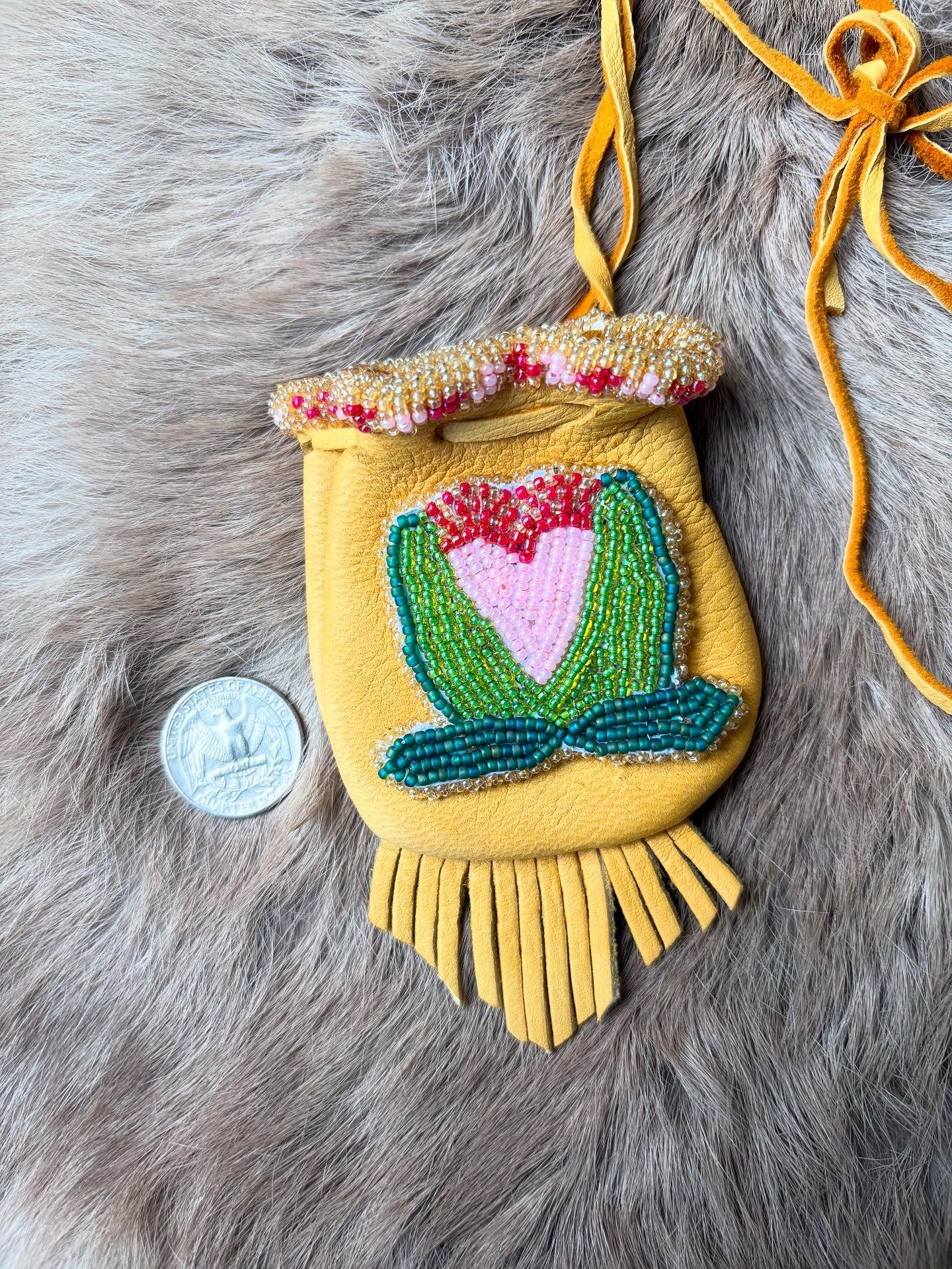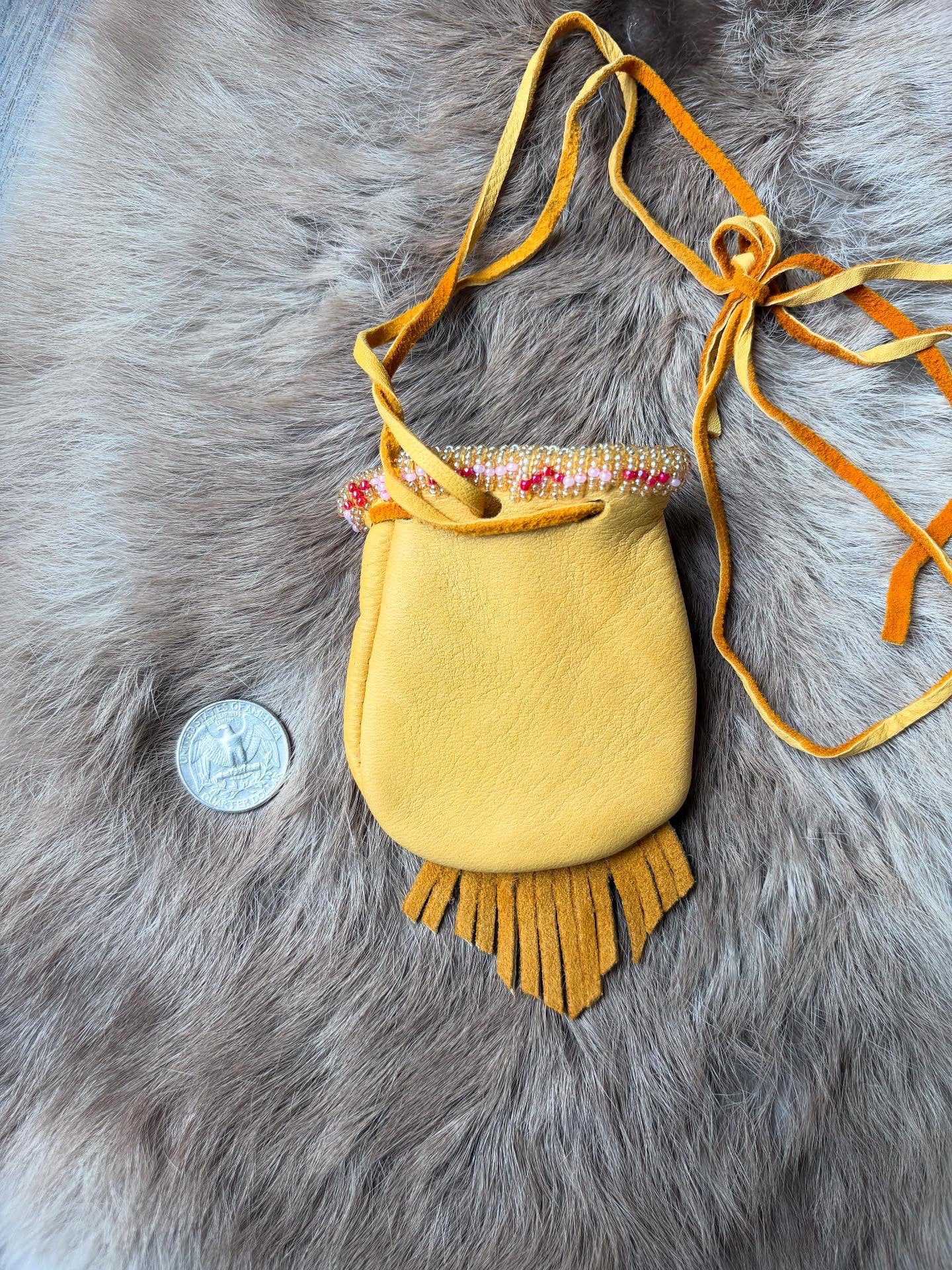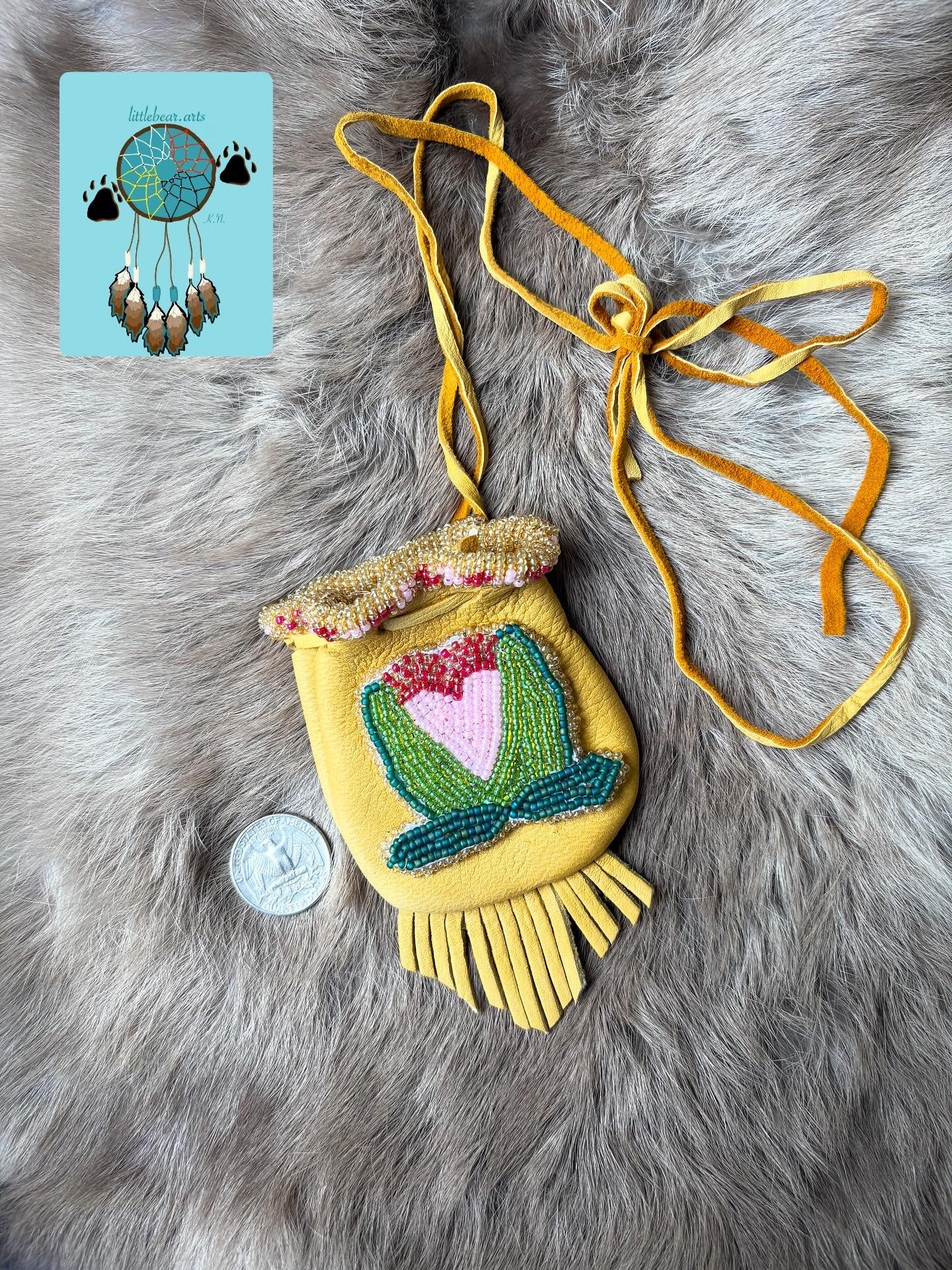 Buckskin medicine pouch with delica beadwork, ojibwe floral design by me.